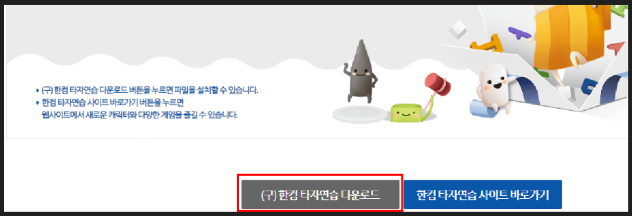 홈페이지에 들어오게 되면 아래쪽에 '(구)한컴 타자연습 다운로드'와 '한컴 타자연습 사이트 바로가기'가 보일 텐데요. 여기서 '(구)한컴 타자연습 다운로드'를 눌러주시기 바랍니다. 그냥 한번 하고 말거라면 한컴 타자연습 사이트 바로가기를 눌러도 되고요.